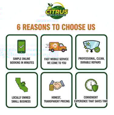 At Citrus Mobile Auto Glass, we specialize in professional windshield chip repair — the kind that stops cracks before they spread. Our focus isn’t on rushing replacements; it’s on saving your original glass with clean, precise, long-lasting repairs that restore strength and clarity. We serve Redlands, Yucaipa, Highland, and the greater Inland Empire, offering fast mobile service that comes straight to your driveway, workplace, or wherever you need us. Using high-quality resins, proper curing techniques, we’re able to prevent further damage and extend the life of your windshield. If you’ve got a small rock chip, we handle it quickly, cleanly, and correctly, before it turns into a costly full crack