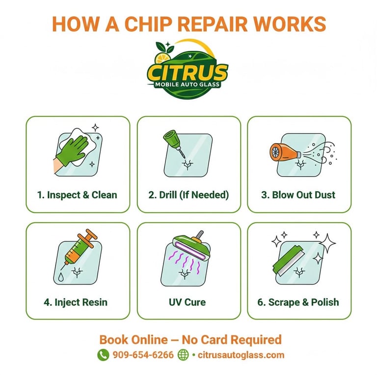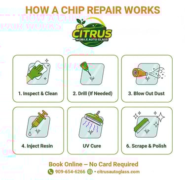 At Citrus Mobile Auto Glass, we specialize in fast, clean, high-quality chip repairs throughout Redlands, Yucaipa, and surrounding Inland Empire cities. This guide breaks down exactly how a professional chip repair works — so you know what to expect and why timing matters.